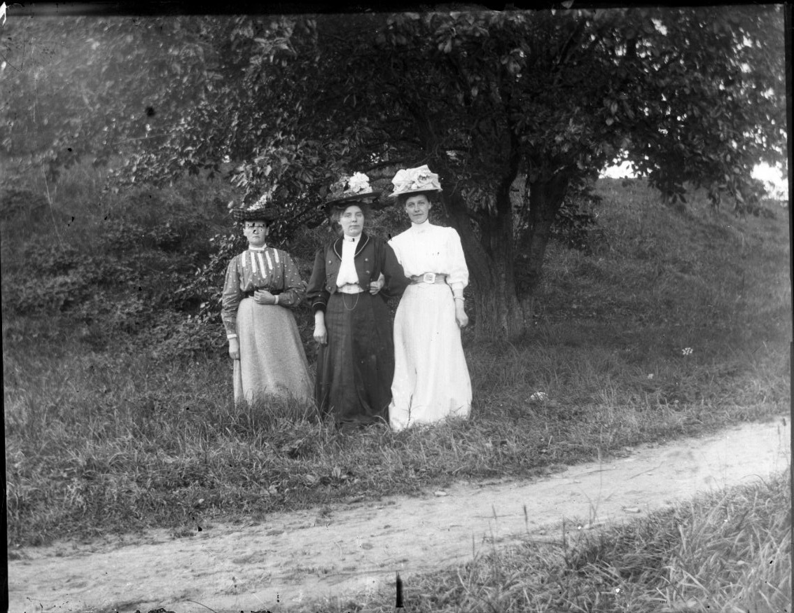 Tre okända kvinnor med stora hattar står vid ett träd intill en stig.