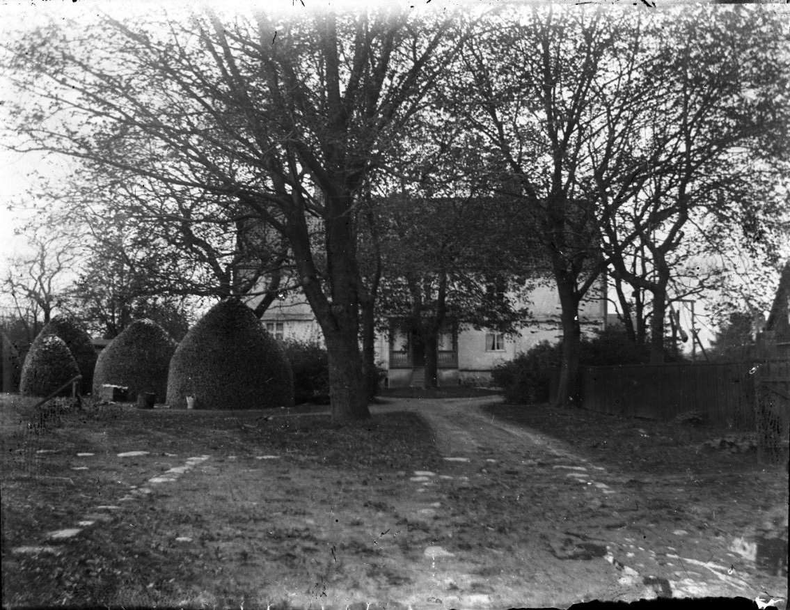 En lerig väg, delvis trädkantad leder fram mot en okänd putsad tvåvåningsbyggnad.