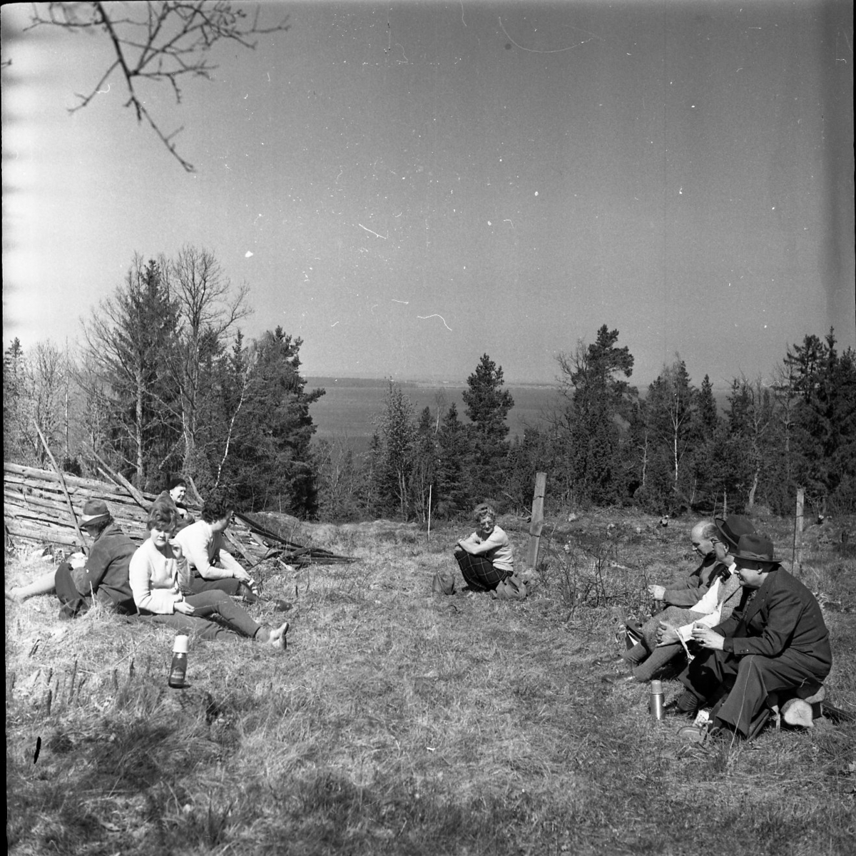 Kvinnor och män sitter på en höjd i det gröna och fikar.