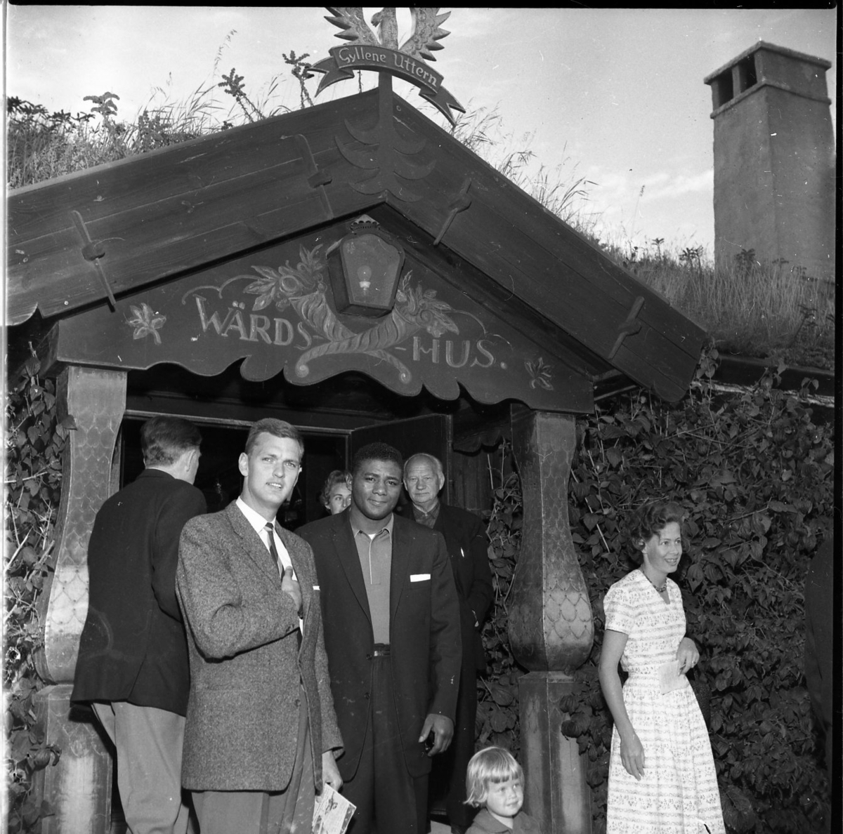 Två män står vid entrén till restaurang/hotell Gyllene Utter. Mannen till vänster är ägaren Rolf von Otter som håller den autograf han just fått av den andra mannen, boxaren Floyd Patterson.