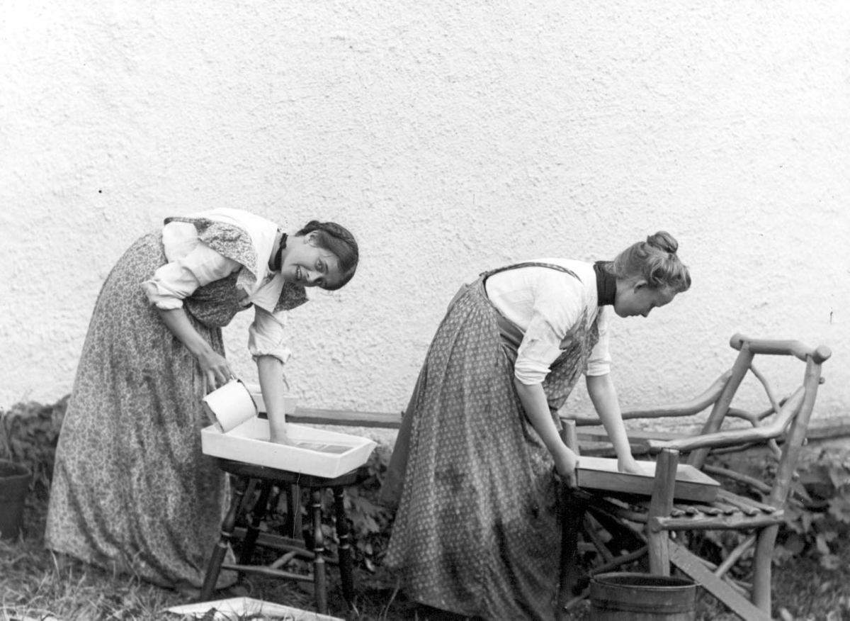 Två unga kvinnor i ljusa blusar med uppkavlade ärmar och långa mönstrade klänningar står på rad utmed en husvägg böjda över små kar med vatten och fotografier. De sköljer efter framkallning. Kvinnan till vänster, Freja Lindblad, har en liten kanna med vatten i handen och vänder sig mot fotografen. Kvinnan till höger är Mimmi Allard.