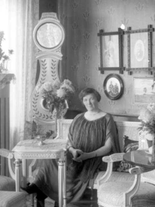 Porträtt av Selma Sundbeck i hemmiljö. Hon sitter i en soffgrupp av gustaviansk stil intill en Moraklocka. Vaser med blommor på borden intill, hon fyller 60 år.