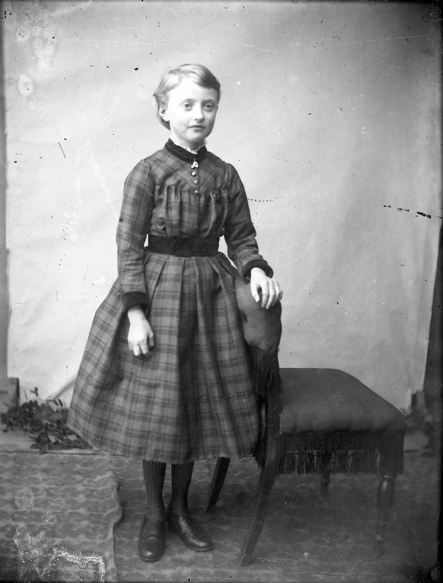 Porträtt av en okänd flicka i rutig klänning. Hon står vid en stol och håller vänster hand på stolsryggen.