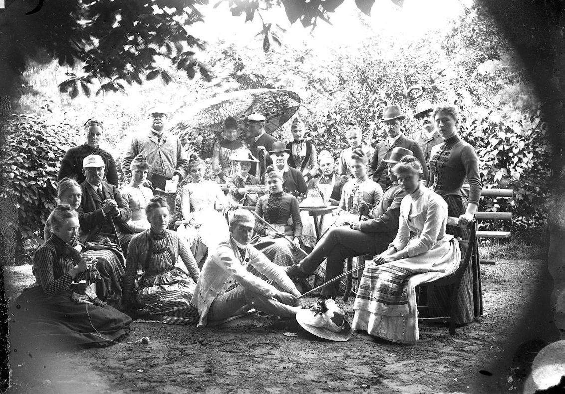 Ett okänt sällskap med kvinnor i män sitter vid trädgårdsmöbler i skuggan av träd.