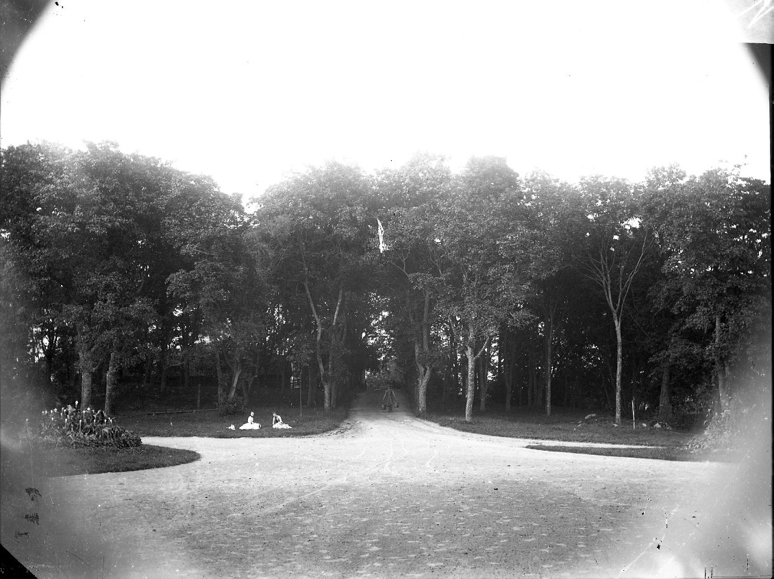 möjligen en gårdsplan i förgrunden med en allé i bildens djup. Två flickor i ljusa kläder sitter på en gräsyta till vänster. En kvinna med en hink i vardera hand går i allén.