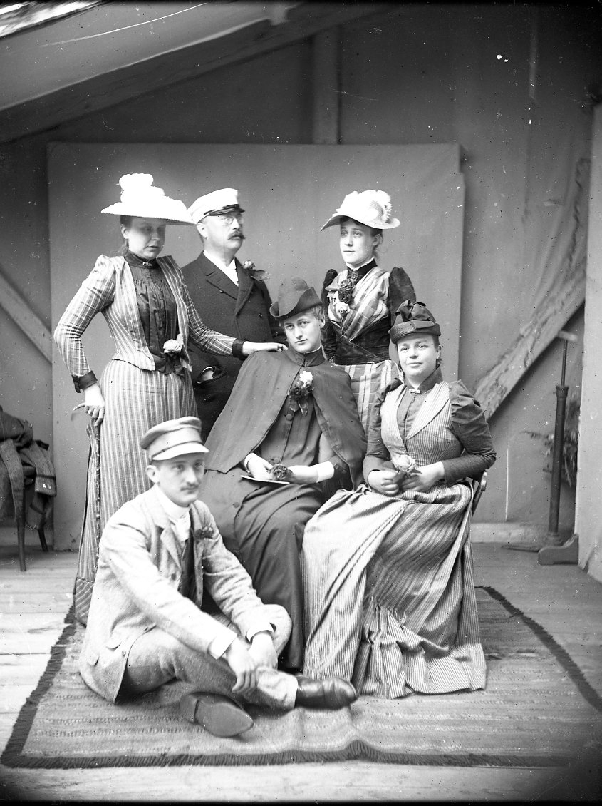 Gruppbild med fyra kvinnor och två män i en fotoateljé.