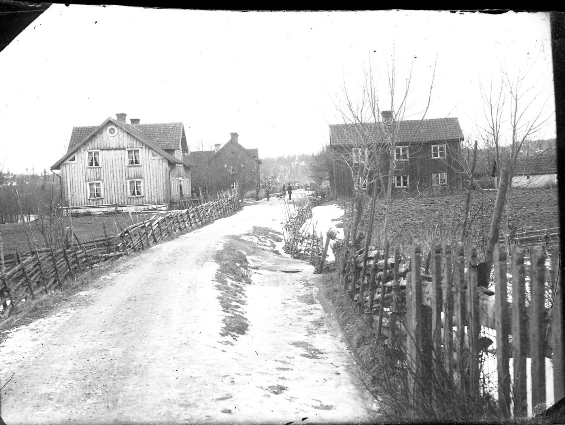 En isig landsväg kantad av gärdesgård leder fram mot okänd bebyggelse.