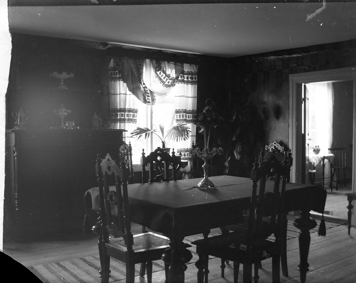 Interiör från ett okänt hem. Höga stolar med figursågad ryggplatta, flätad sits och svarvade ben runt ett kvadratiskt bord med svarvade ben. Trasmattor på golvet.