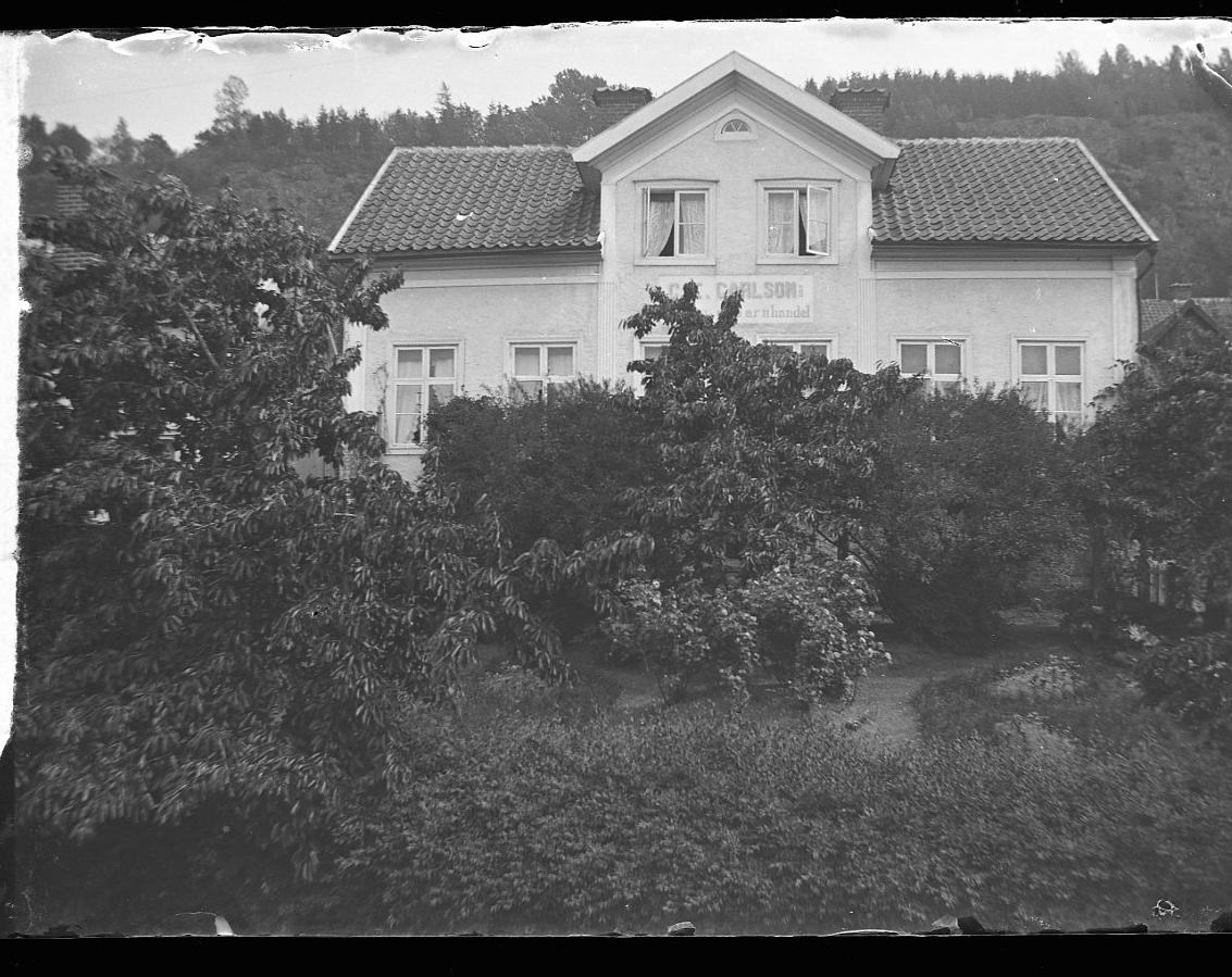 Putsad byggnad med frontespis med två fönster. Under detsamma en text med bland annat "Carlsons", troligen Garnhandel.