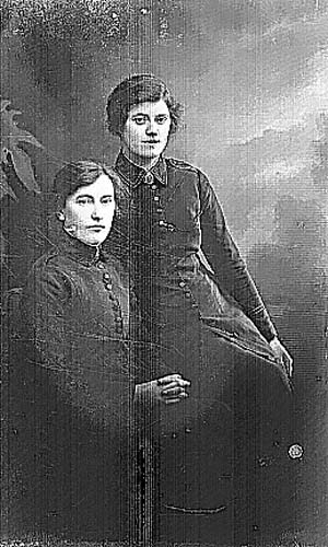 Två kvinnor i frälsningsarméns uniform. En sitter i en stol och den andra på dess armstöd.