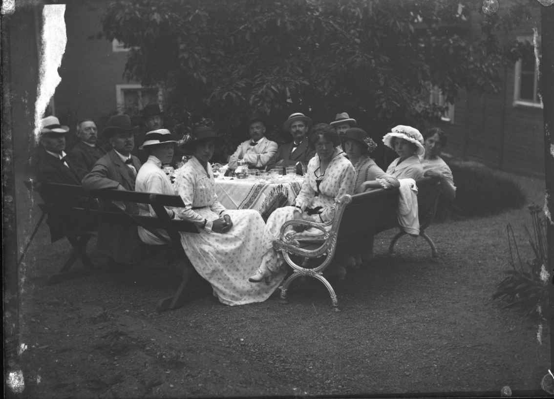 Tretton män och kvinnor sitter i en trädgård. Glas och flaskor på ett bord med duk.