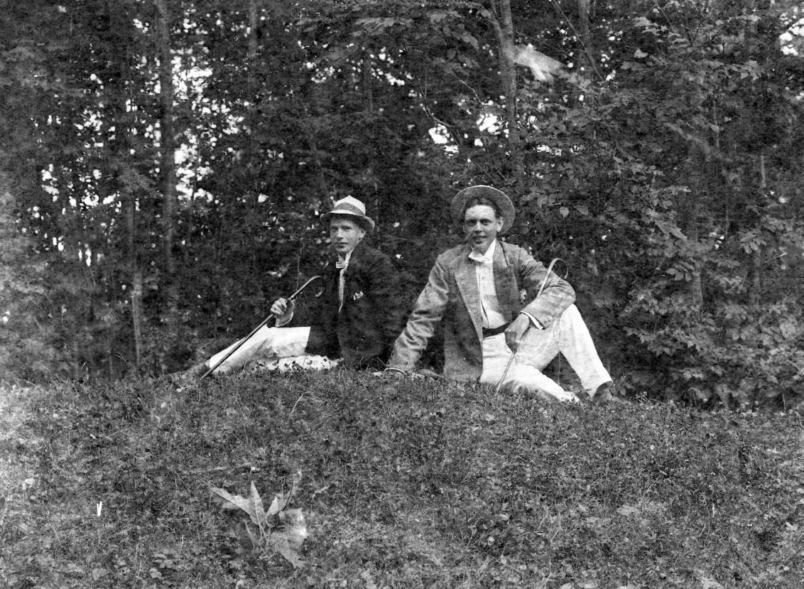 Två unga män med hatt och spatserkäpp sitter på en gräsmatta, troligen i närheten av Visingsborgs slottsruin.