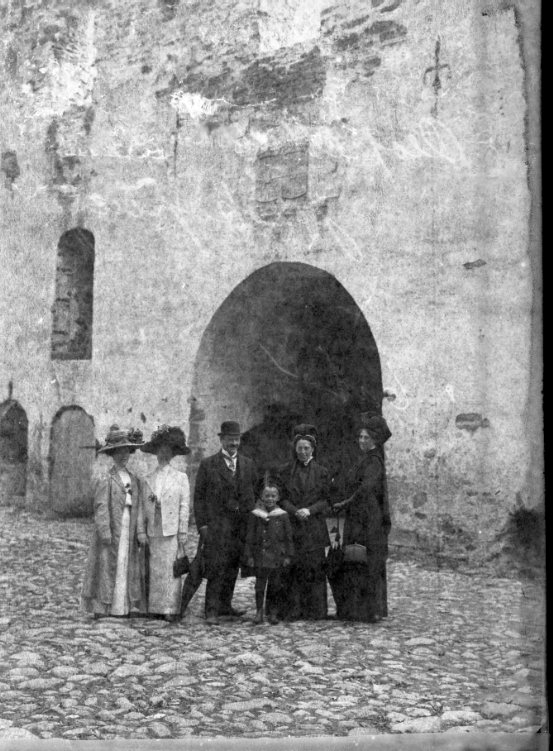 Ett sällskap med fyra kvinnor, en man och pojk står på inre borggården till Visingsborgs slottsruin. Två kvinnor ljust och två i mörkt.