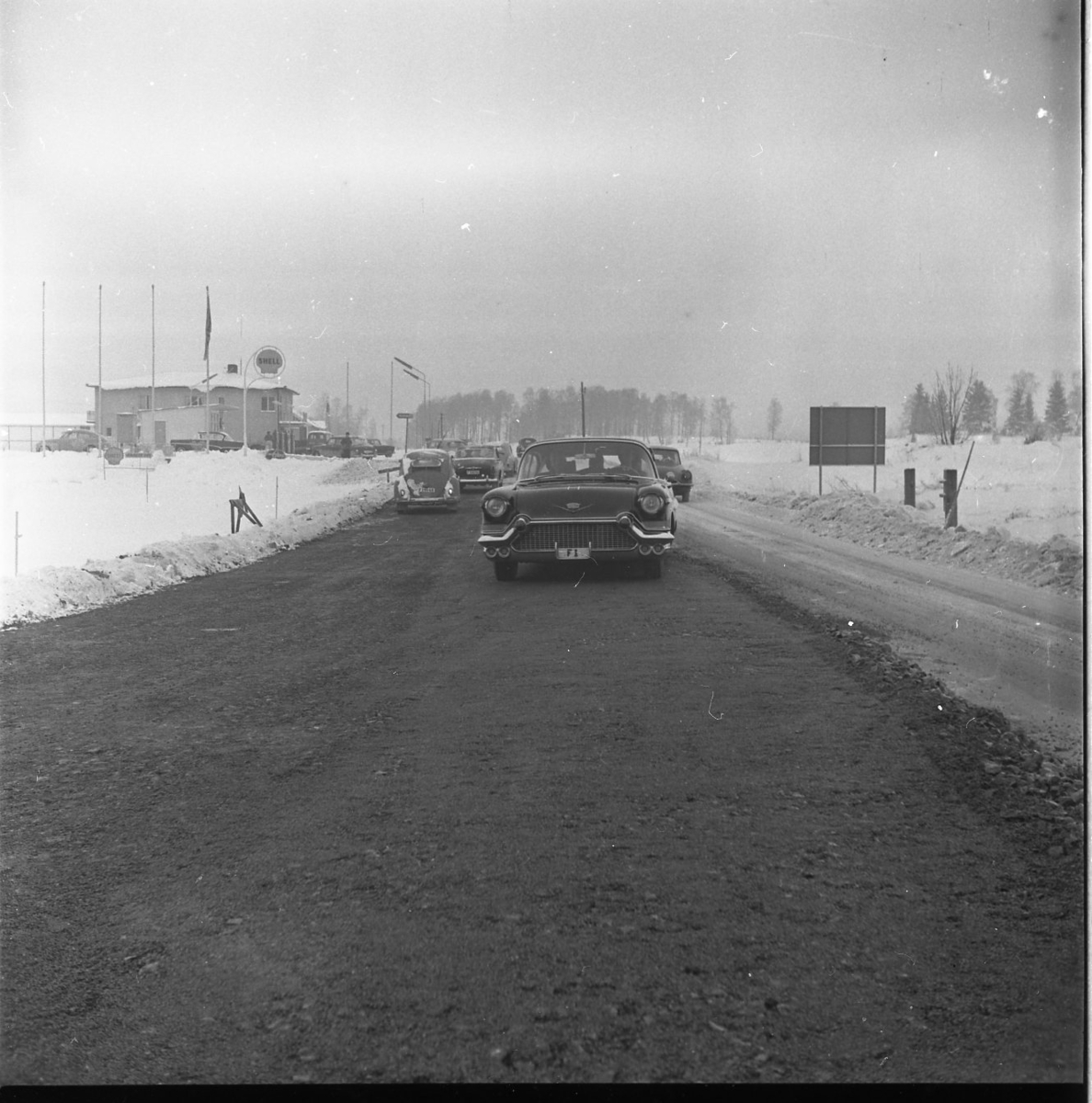 Bilar kör över en nyligen asfalterad väg. Vid sidan av vägen finns en Shell-mack.