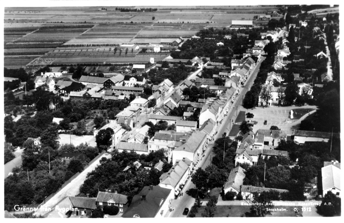 Flygfotografi över Gränna från söder mot norr med torget till höger.