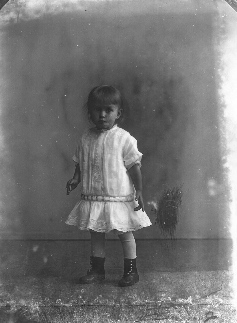 Porträtt av en liten flicka i ljus klänning och kängor.