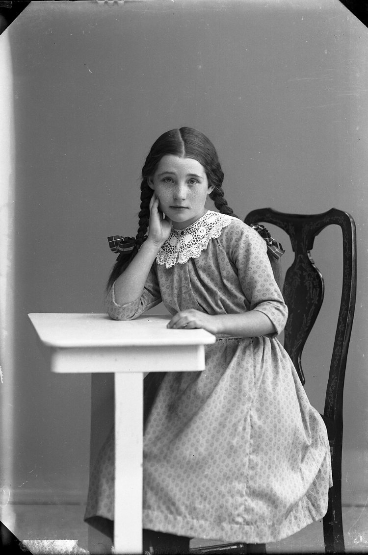 Porträtt av en flicka i mönstrad klänning och spetskrage. Hon sitter vid ett bord och vilar huvudet i höger hand. Hon har två flätor i håret.
