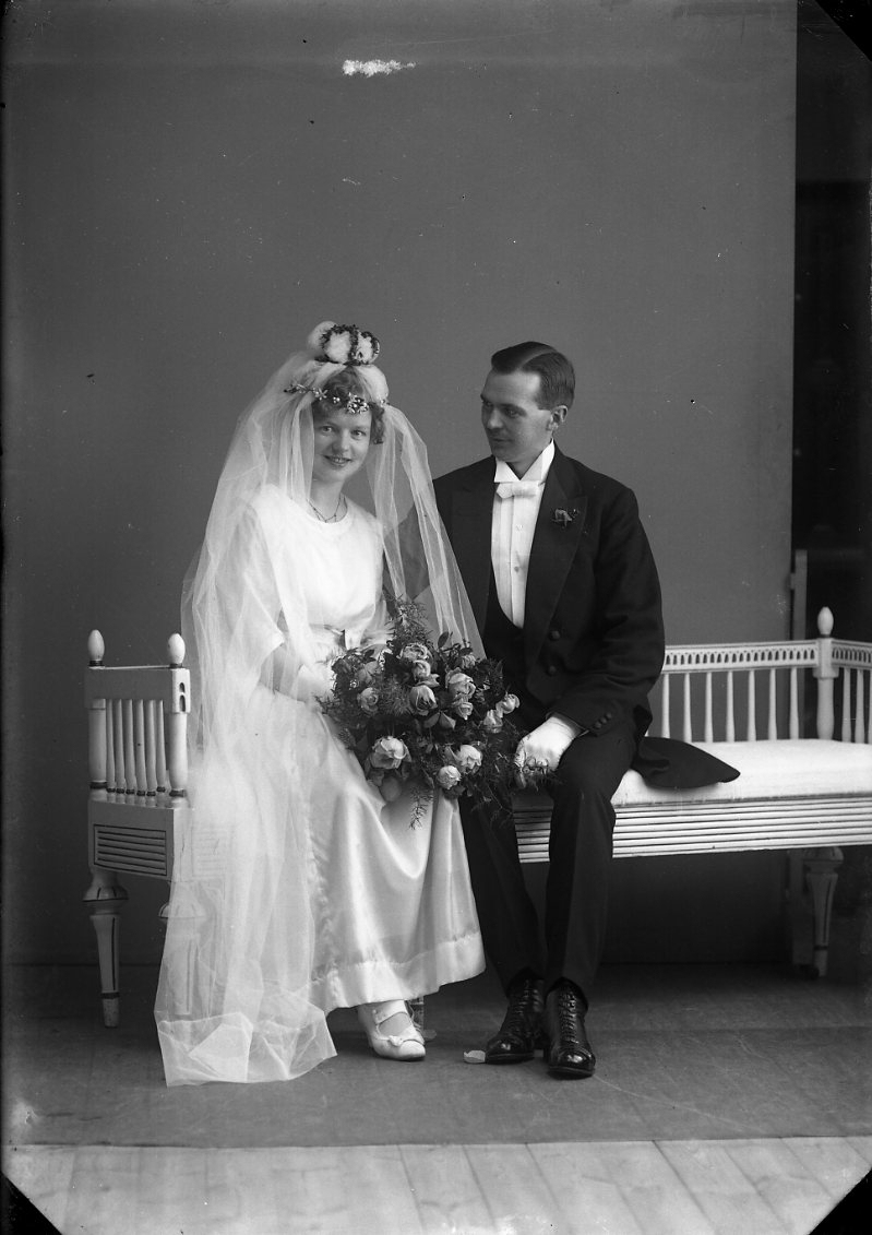 Brudparet Norstedt och Knutson. De sitter i en soffa av gustaviansk stil. Hon har liten krona blommor och blad sannolikt, och en stor bukett i händerna. Hon ler mot fotografen. Brudgummen tittar på henne