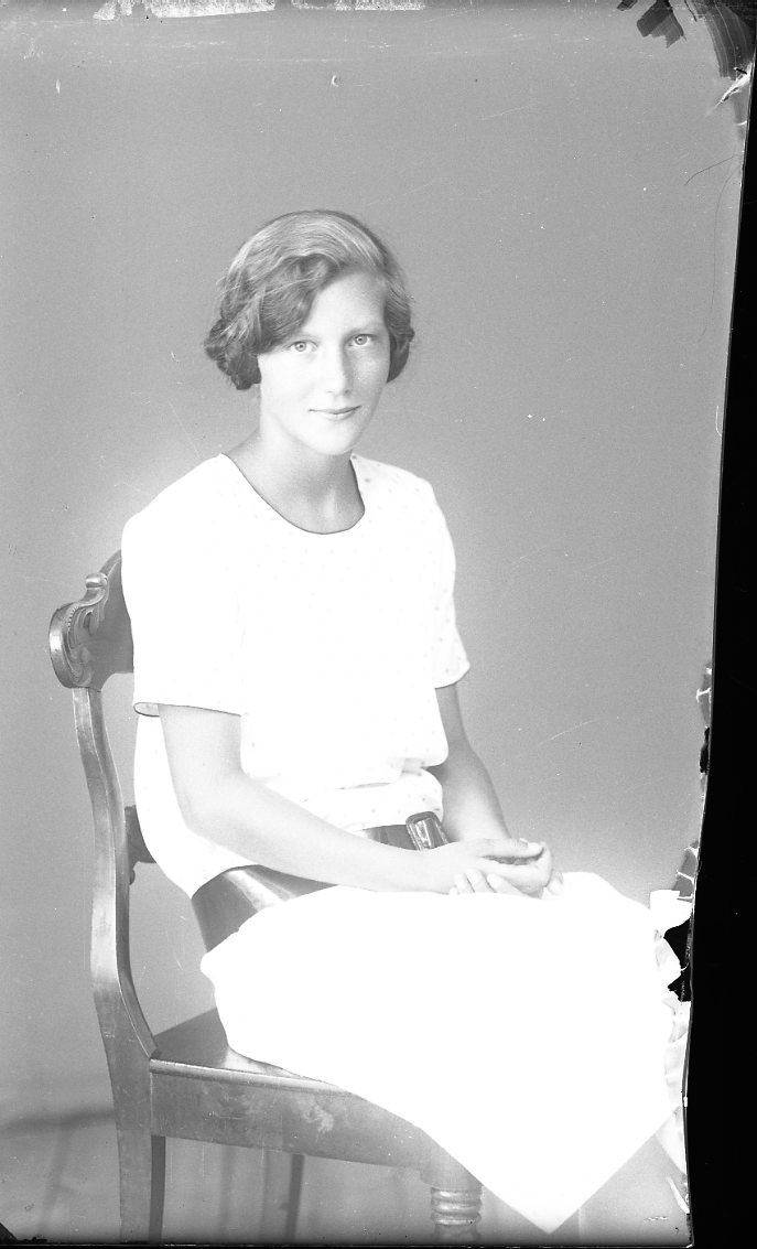 Porträtt av en flicka som sitter på en stol. Hon heter Britta eller Aurora Carlsson.
