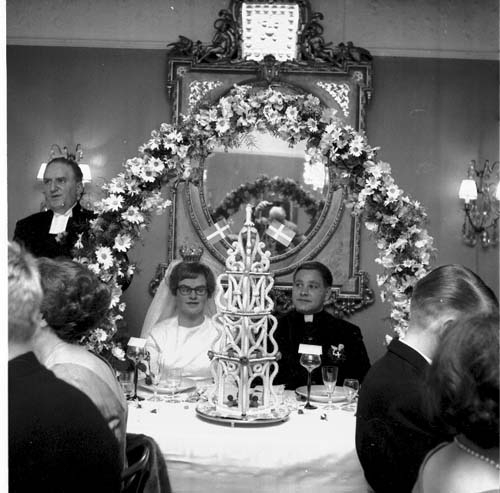 Ett brudpar sitter och lyssnar på ett tal av brudens far, kyrkoherde Wallis Wendel. Brudparet sitter i en portal av blommor.