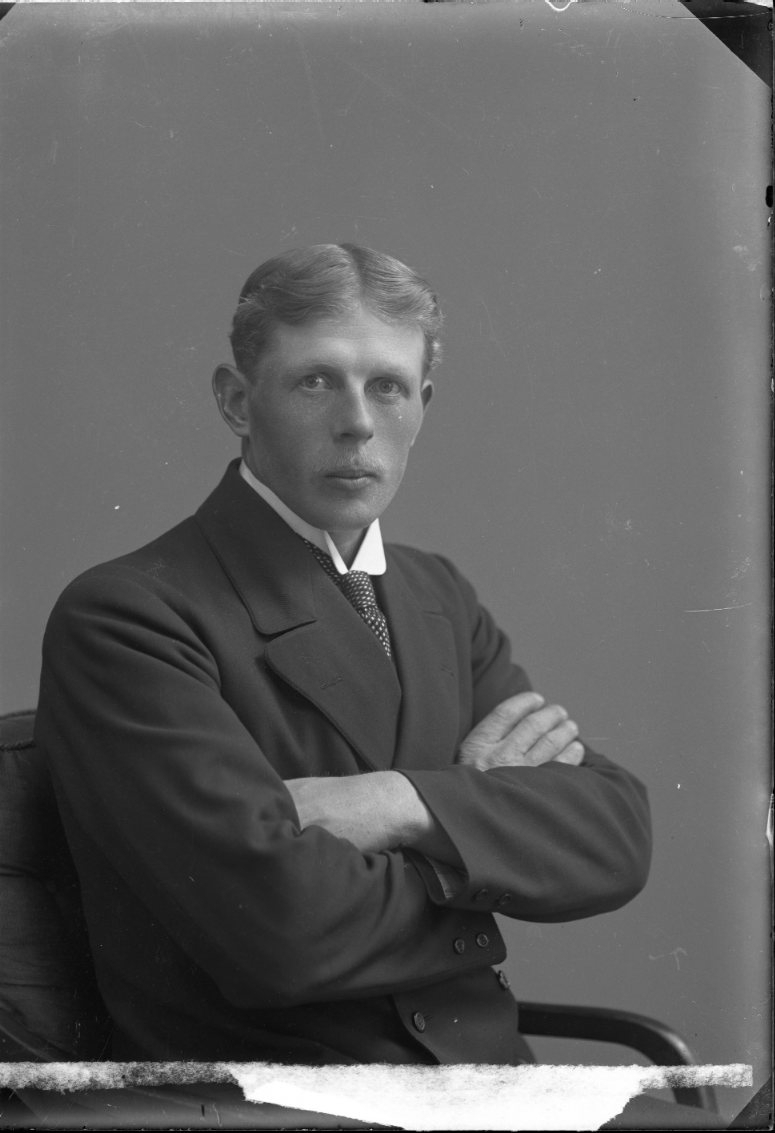 Porträtt av en ung man med prickig slips. Han sitter på en stol med armarna i kors.
