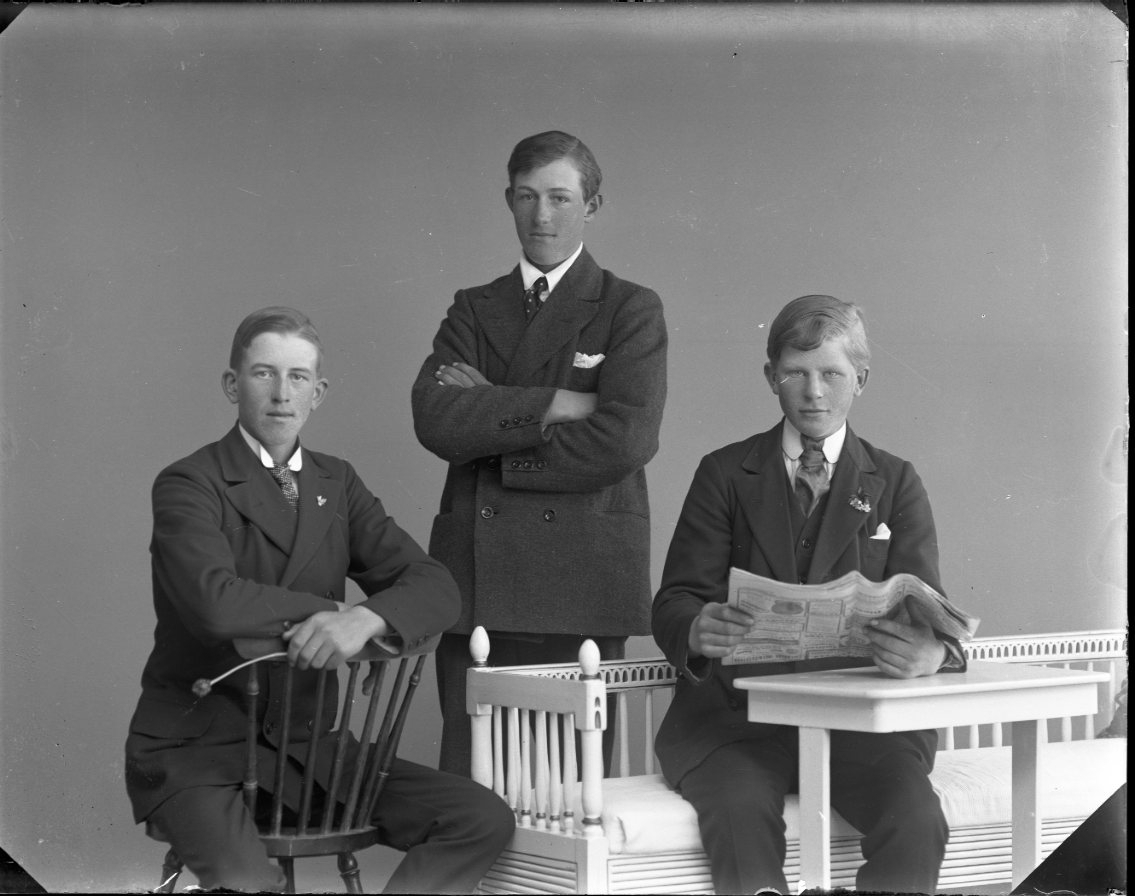 Gruppbild med tre tonåriga pojkar, två sitter vid en bord och en står intill. En har en uppslagen tidning i händerna.