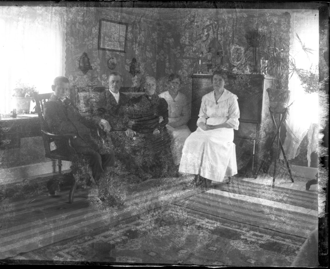 Interiör hos nämndeman Carlsson i Uppgränna. Familjen sitter i ett hörn av rummet: två flickor, en pojke samt en kvinna och en man.