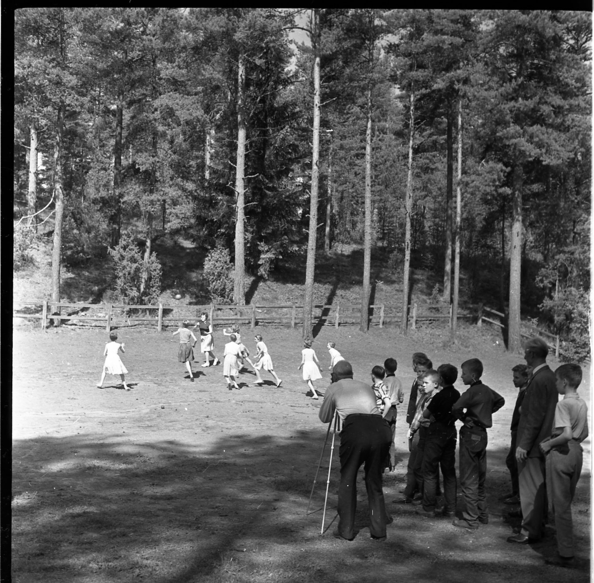 Barn leker på en gräsmatta vid ett skogsbryn. Några pojkar står bredvid och tittar på. En man står och fotograferar de lekande barnen.