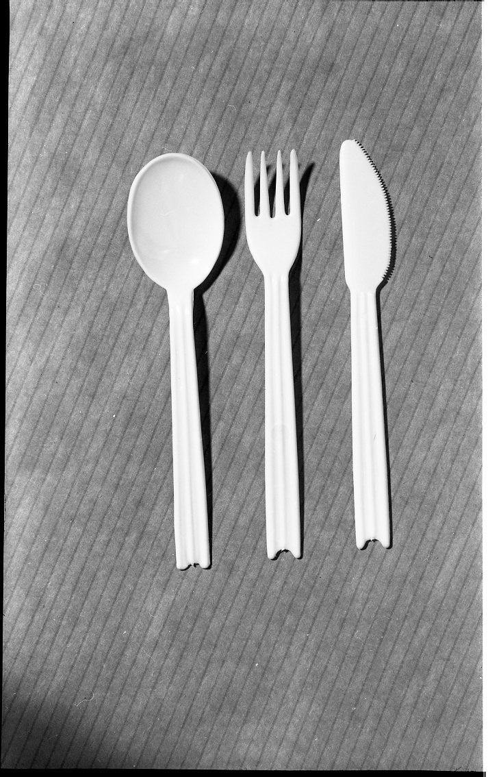 Plastbestick: sked, gaffel och kniv. Produktfotografering för Gränna Plast-Emballage AB.