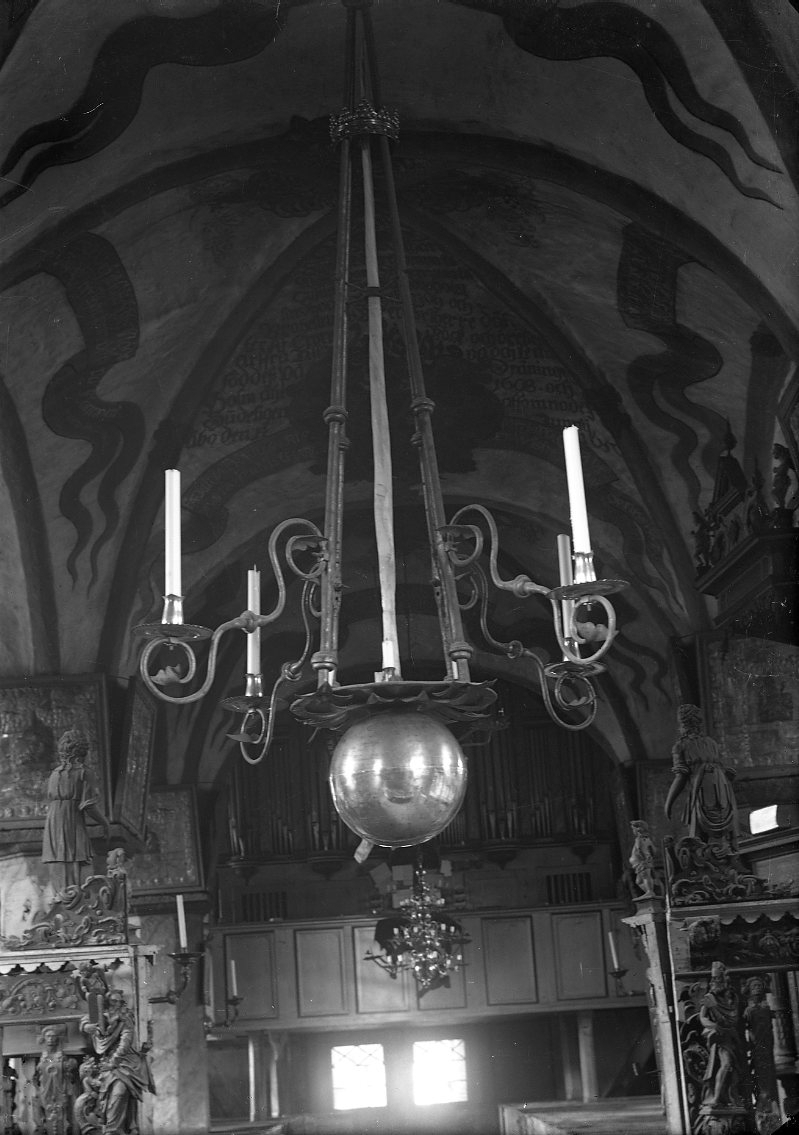 Ljuskrona med narvalshorn, silverklot och armar av förgylld koppar, i Brahekyrkan.