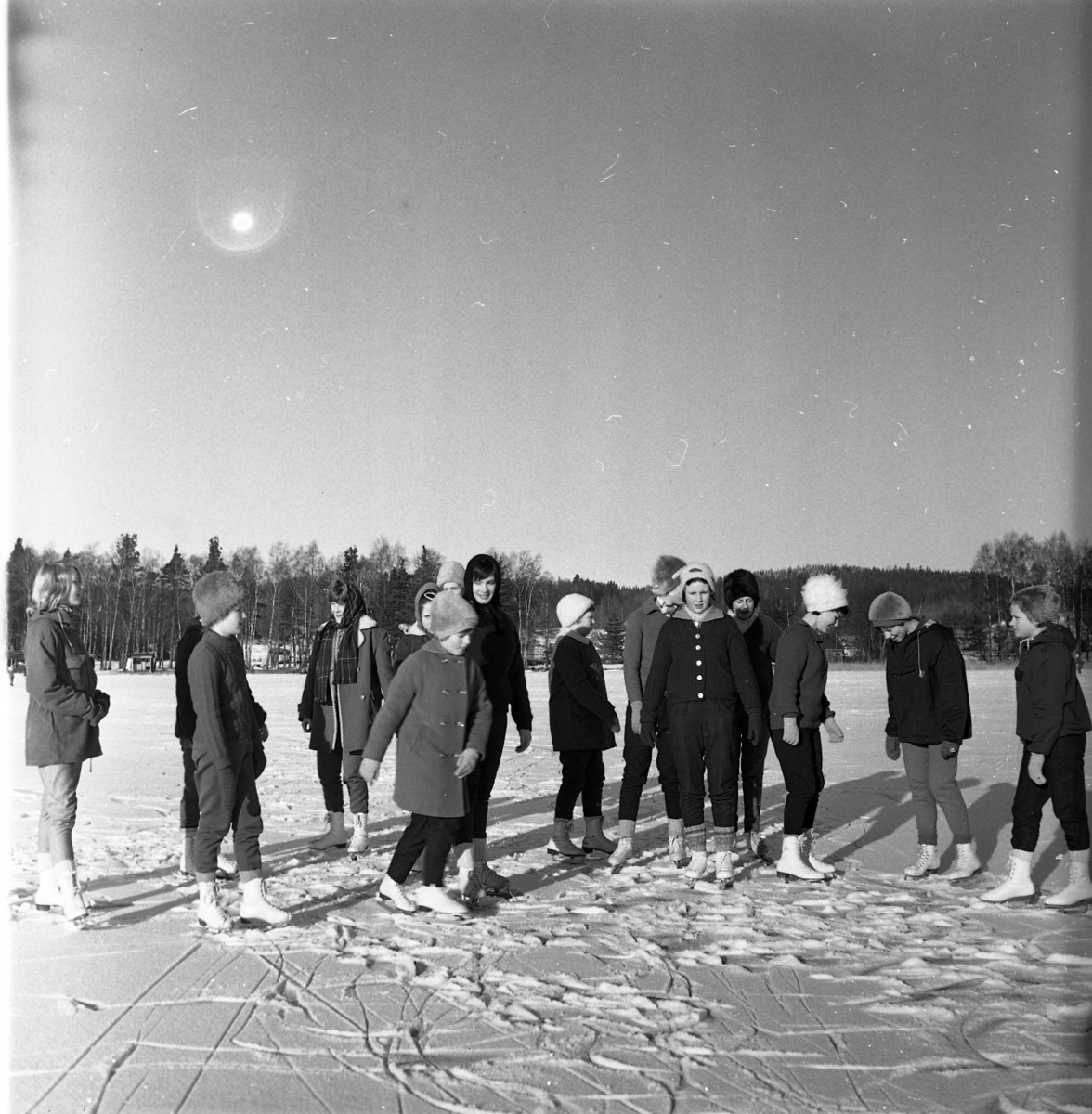 Realskolans vinterlov januari 1961. Några unga personer står iklädda skriskor på en istäckt sjö.