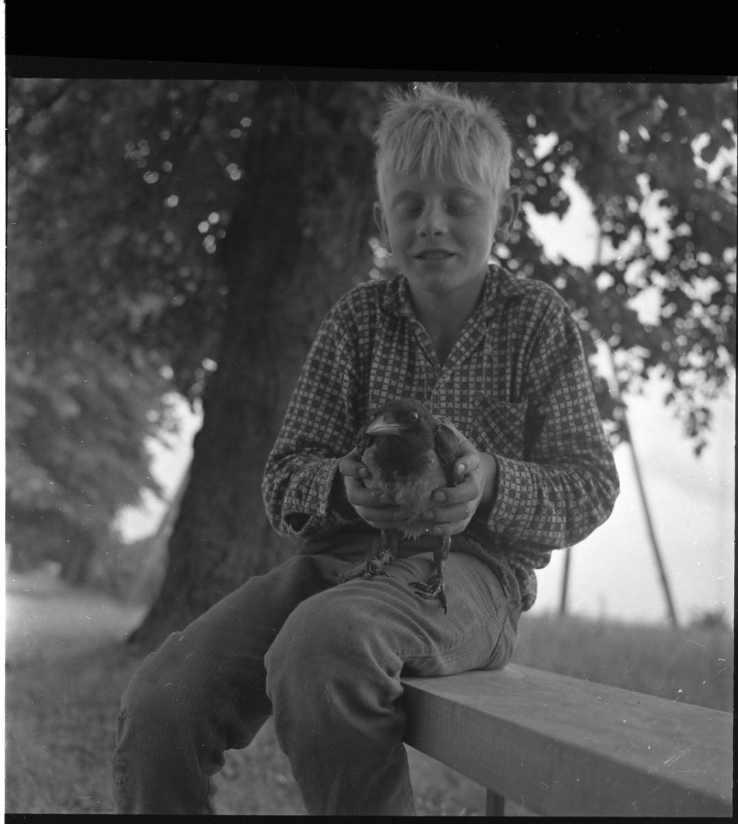 En pojke sitter på ett staket. En kråka står i hans knä och pojken håller händerna om den.
