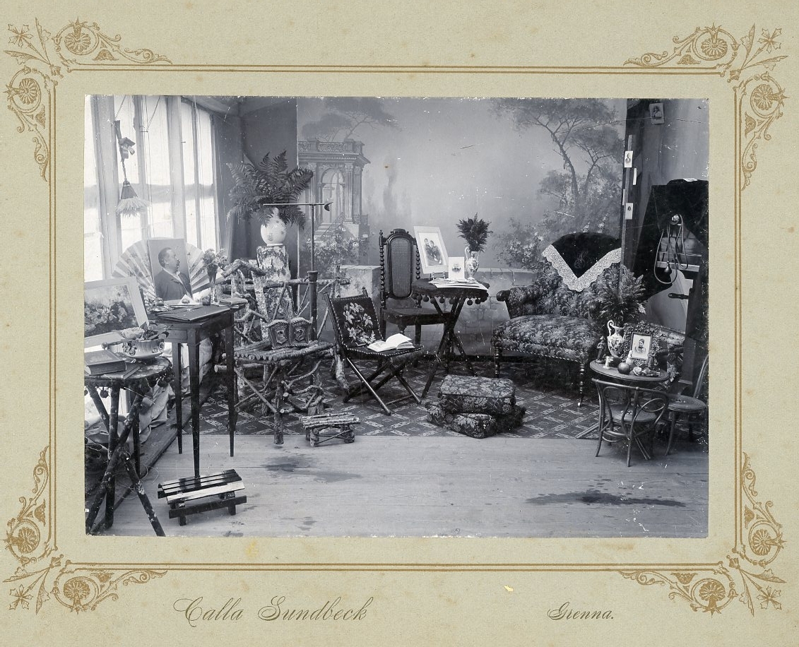 Interiör från "Grönbergs fotoateljé" på 1890-talet. Fond med antikt motiv, stolar, fåtölj, flera bord med inramade fotografier och till höger i bild en kamera på stativ. Liknar den typ som finns kvar efter Calla Sundbeck. En dammvippa hänger vid fönstren till vänster.