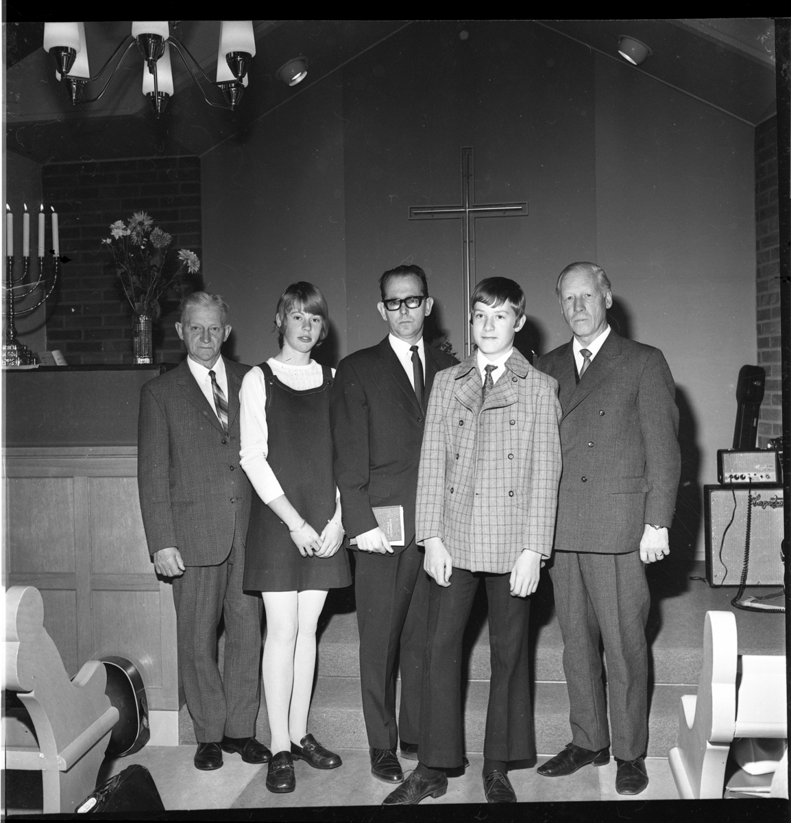 Tre män, en flicka och en pojke fotograferade i en frikyrka.