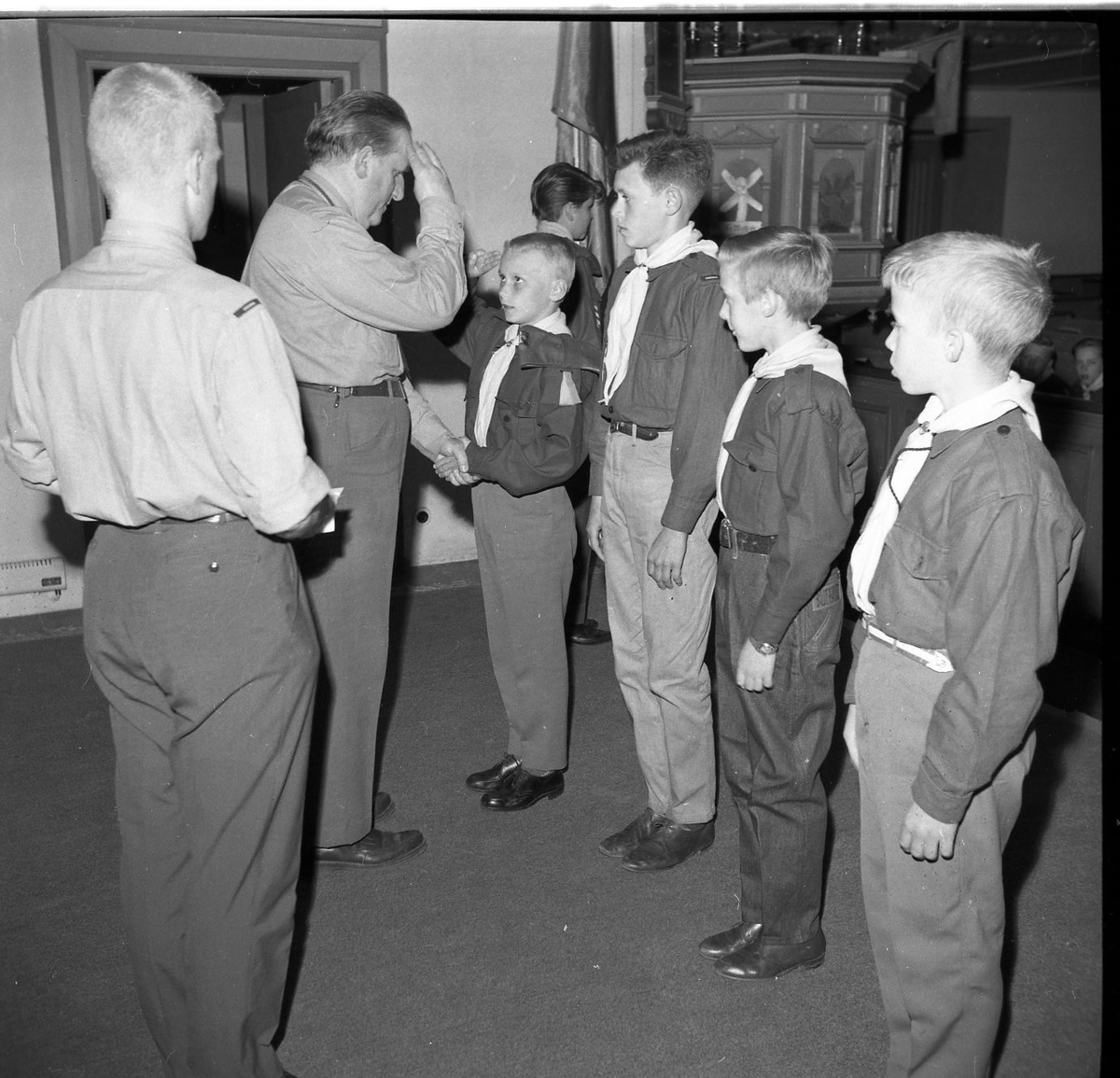 Unga scouter står på rad framför en scoutledare. En av pojkarna skakar hand med scoutledaren och gör samtidigt honnör.