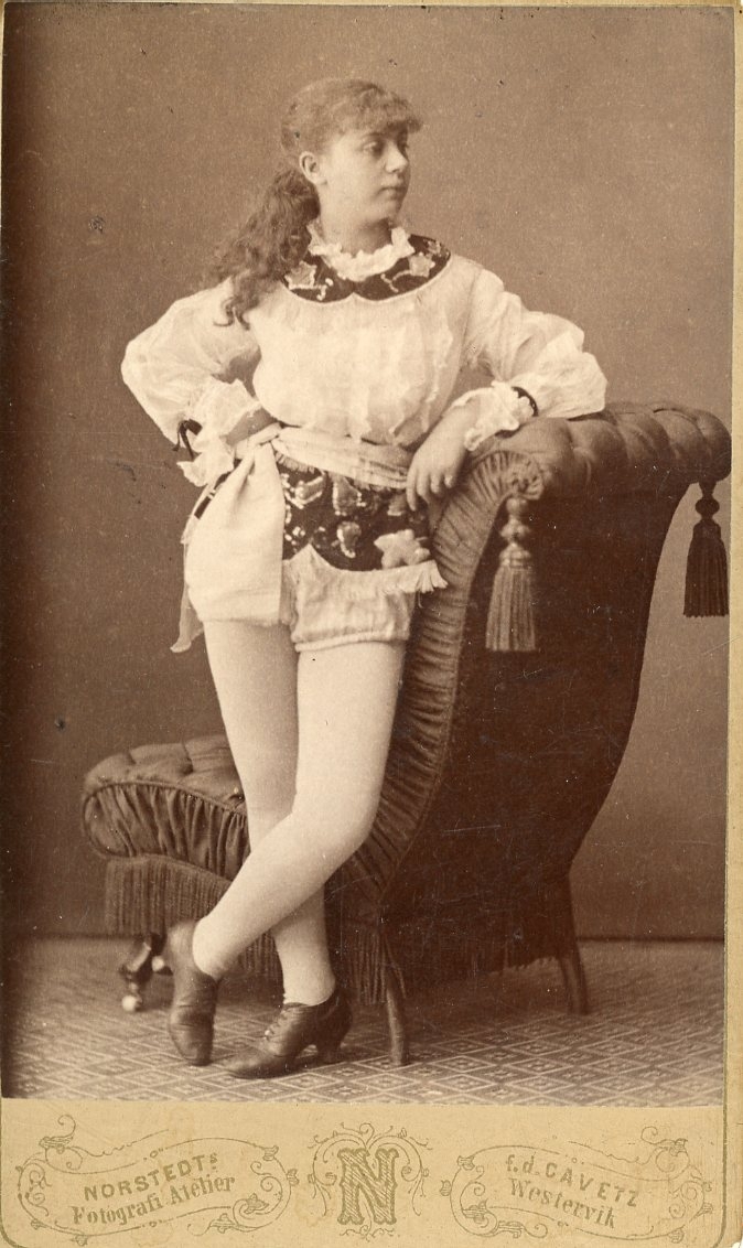 Kabinettsfotografi av en ung kvinna i scen/balettkläder som står lutad mot en fåtölj.