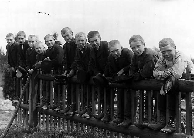 Skolpojkar i Knukebo skola står uppradade på ett staket.