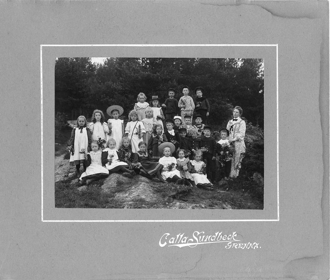 En småskoleklass från Gränna med flickor och pojkar på utflykt på Grännaberget. Barnen har blommor i händerna. Den kvinnliga läraren står till höger.
