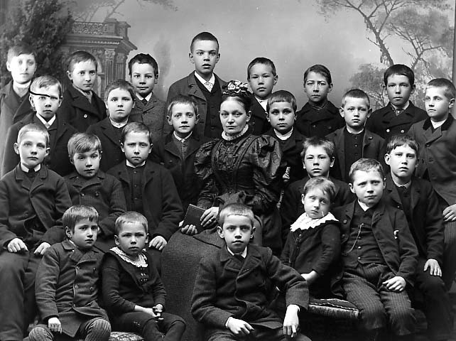 En söndagsskoleklass med pojkar. Den kvinnliga läraren sitter i mitten.
