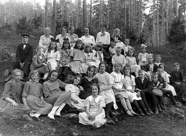 Ungdomar, flickor och pojkar, och kvinnor sitter sommarklädda i ett skogsparti. De är medlemmar i IOGT:s ungdomsloge.