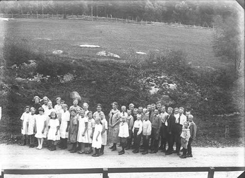 En skolklass med flickor och pojkar står på en grusväg.