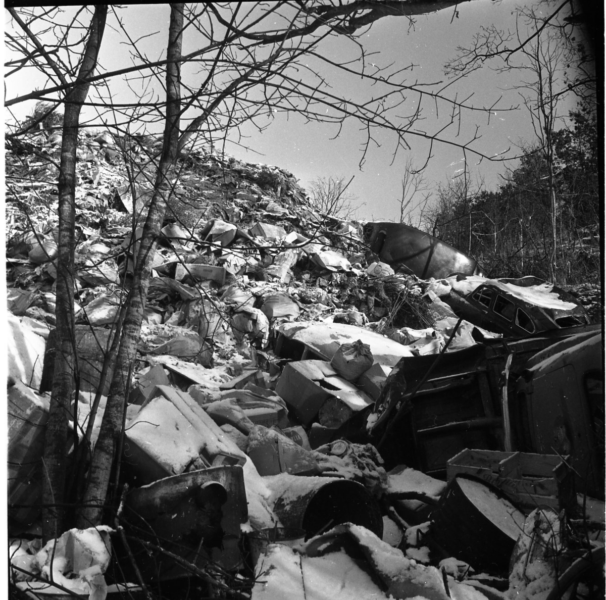 En slänt är täckt med hushållssopor. Även en gammal bil och en husvagn är dumpade på platsen.