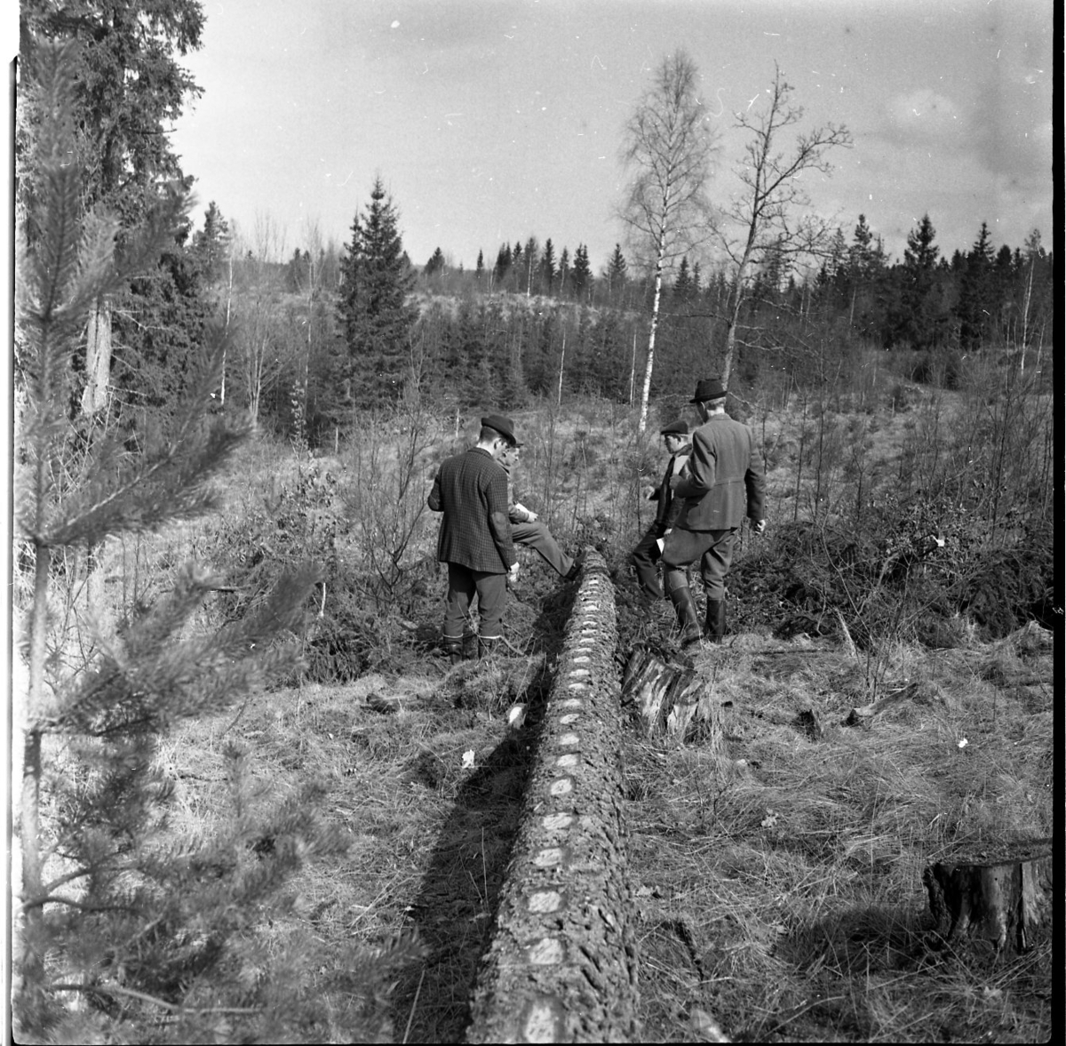 Några män står runt ett fällt träd. De befinner sig i ett kalhygge.