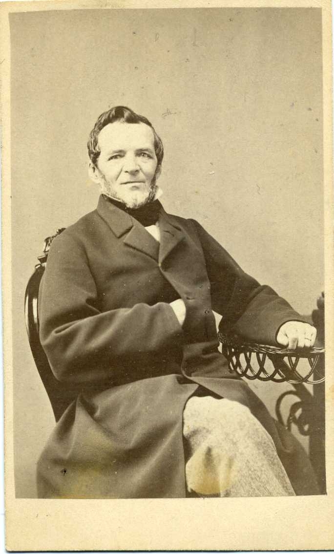 Kabinettsfotografi av en okänd man med skepparkrans. Han sitter vid ett bord med ena handen innanför rocken.