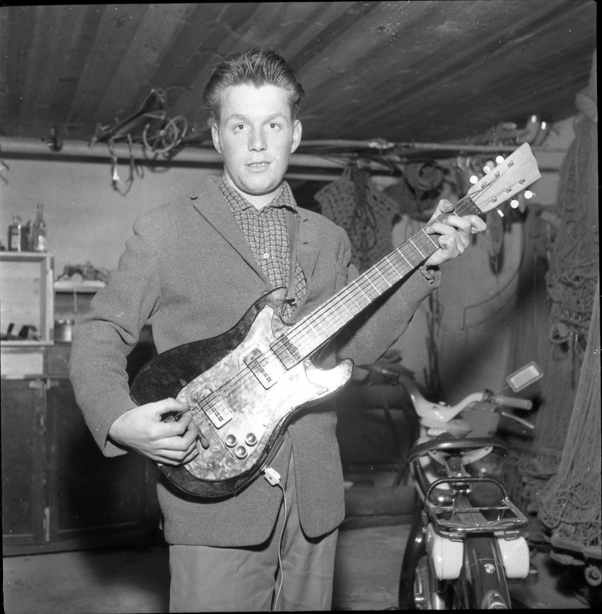 En man spelar på en elgitarr. Han tittar in i kameran.