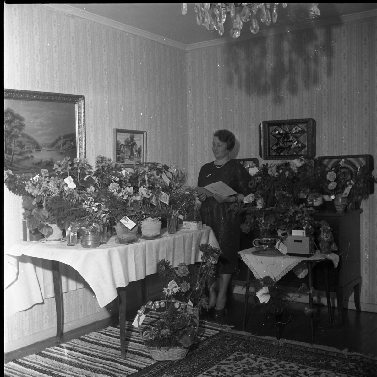 En kvinna står mitt i ett rum. På bord omkring henne står blombuketter och blomkrukor. Hon håller i ett kort.