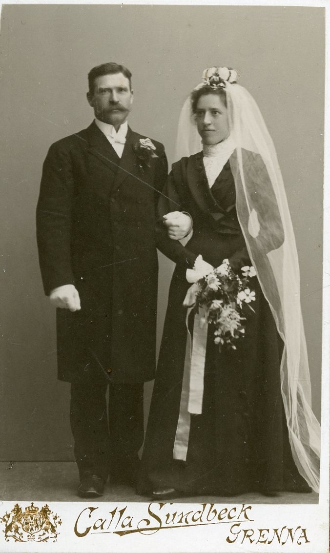 Kabinettsfotografi: okänt brudpar. Bruden i svart.