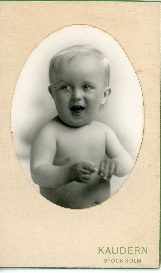 Kabinettsfotografi: ett okänt litet barn med bar överkropp, hen skrattar