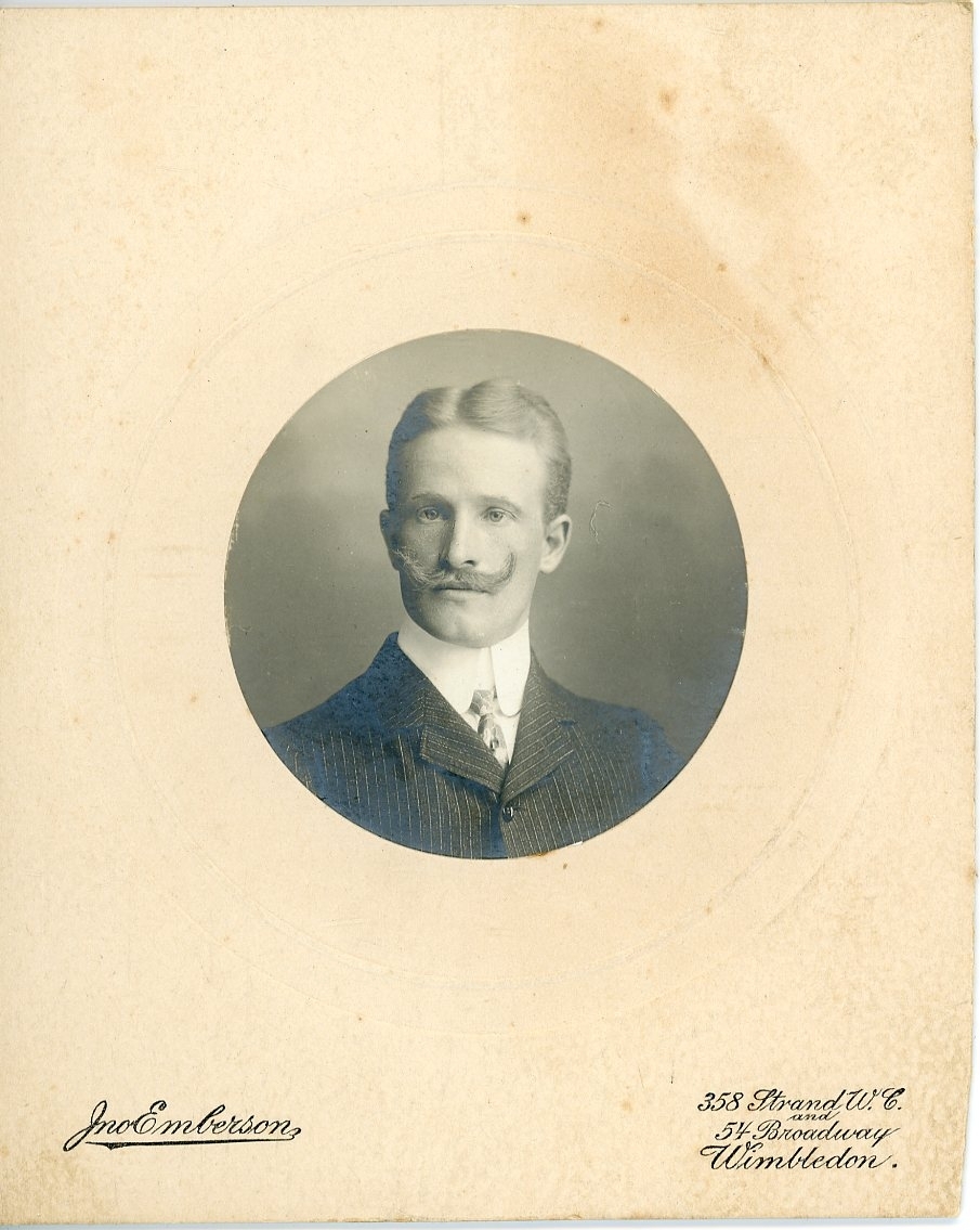 Kabinettsfotografi: bröstbild av en okänd man med stor mustasch, klädd i kritstrecksrandigt och slips.