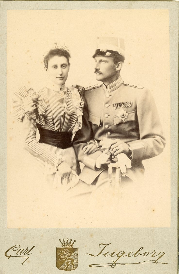 Kabinettsfotografi: prinsessan Ingeborg och prins Carl, han i uniform.